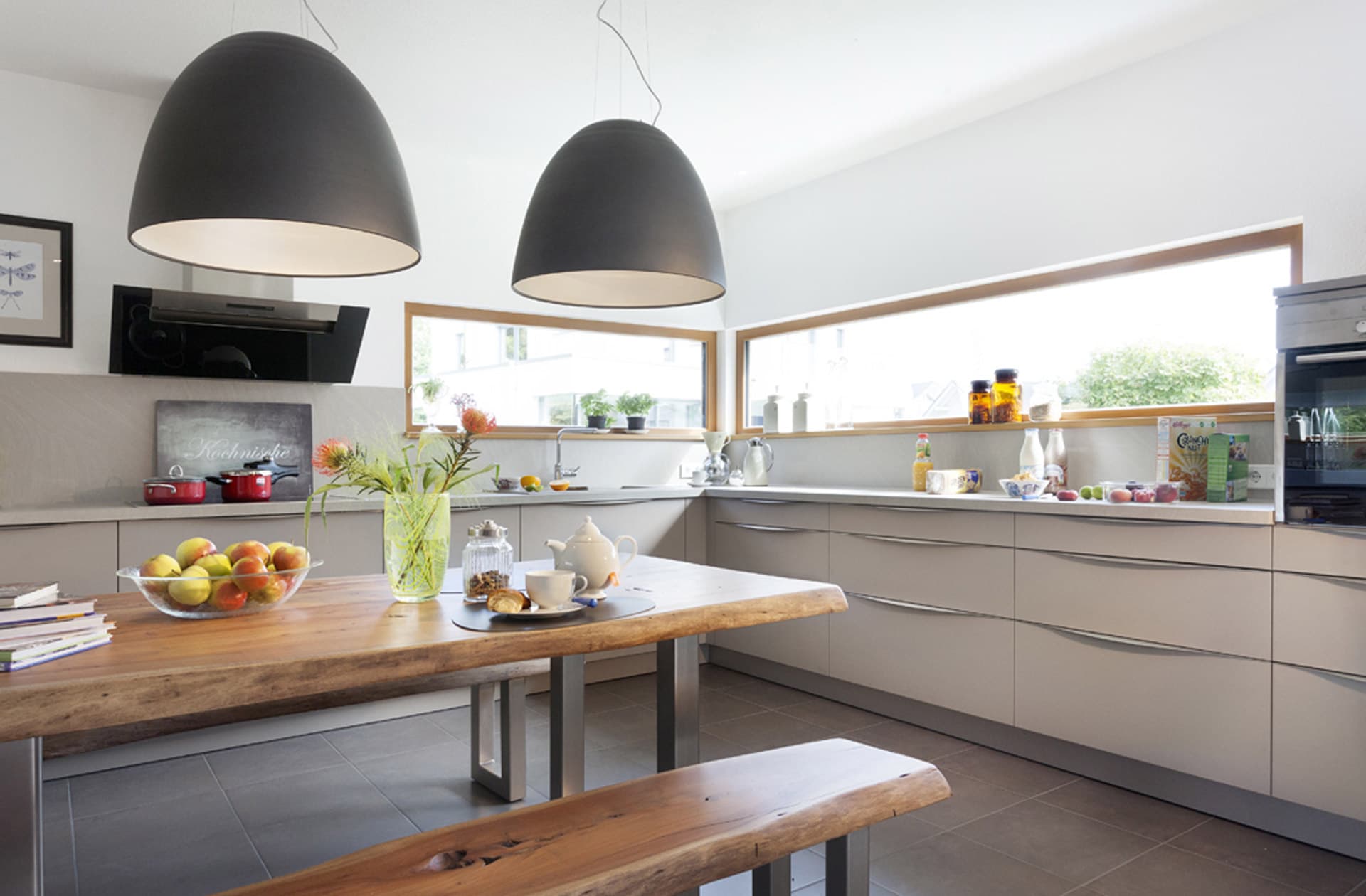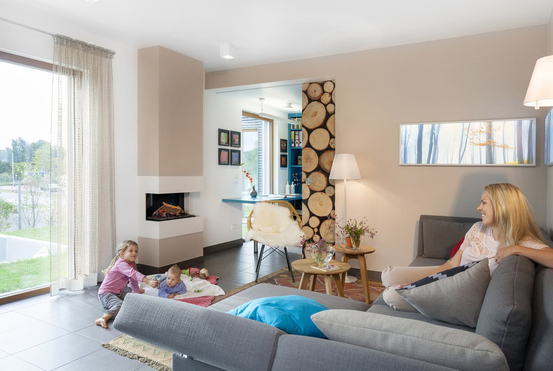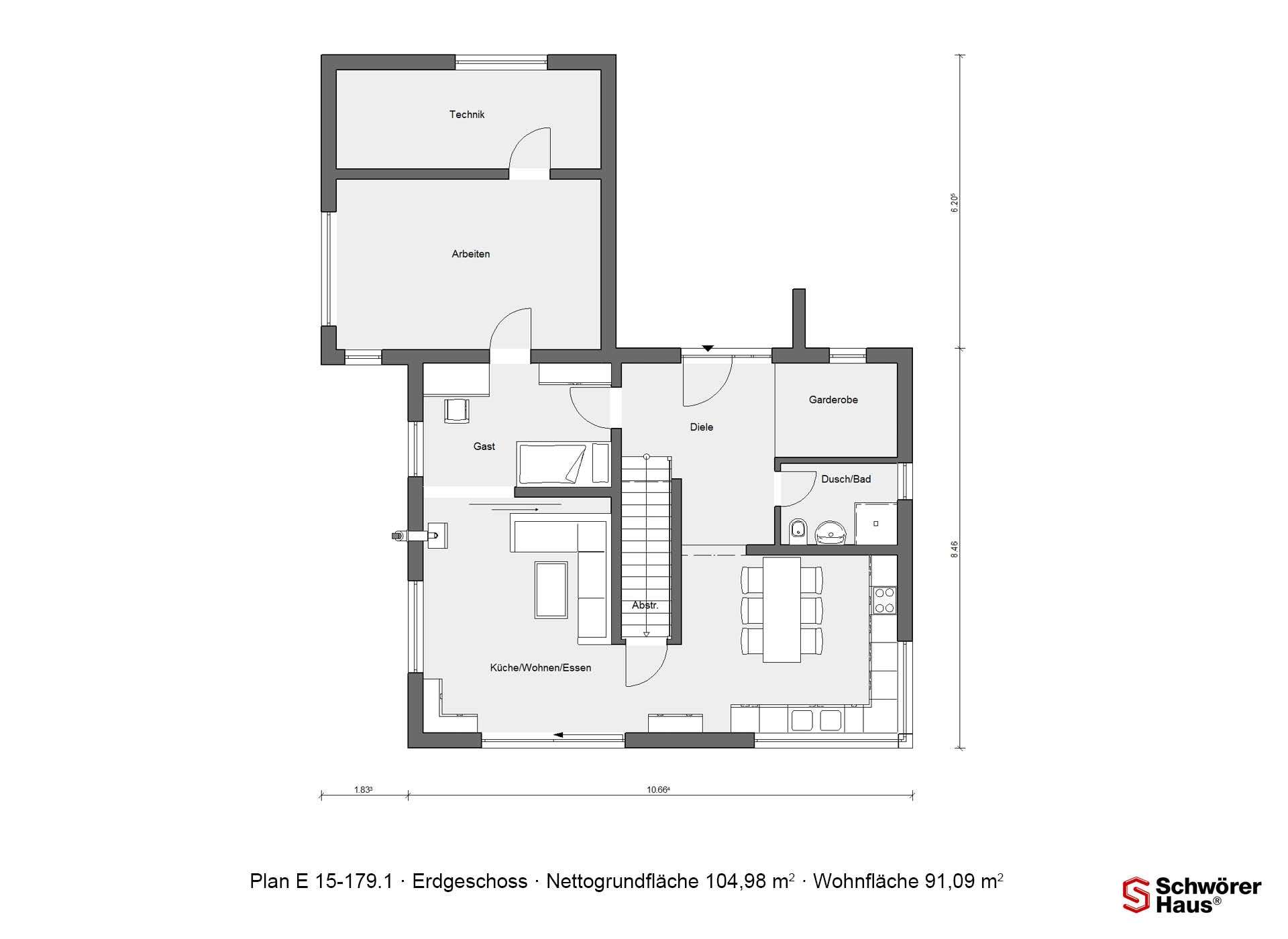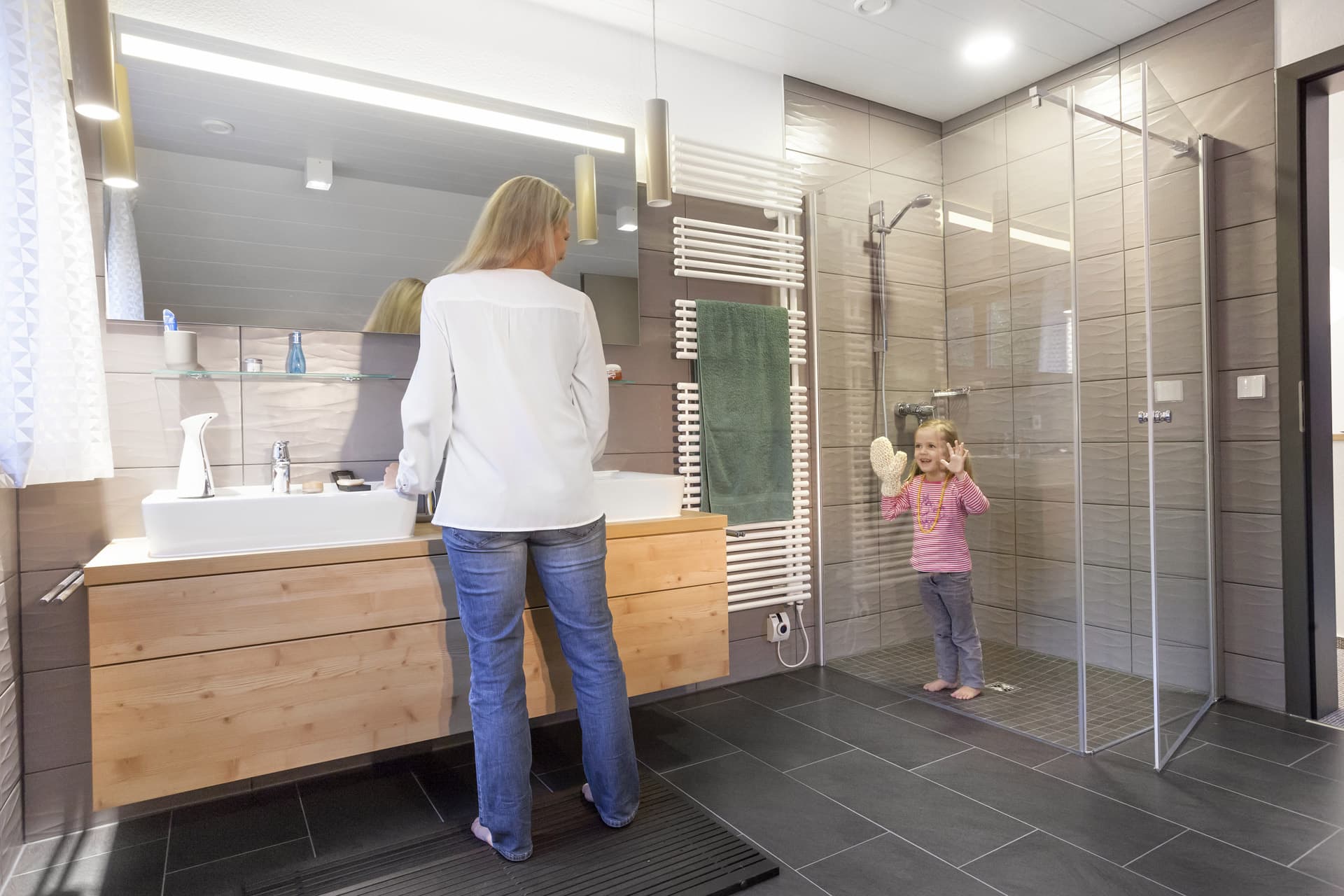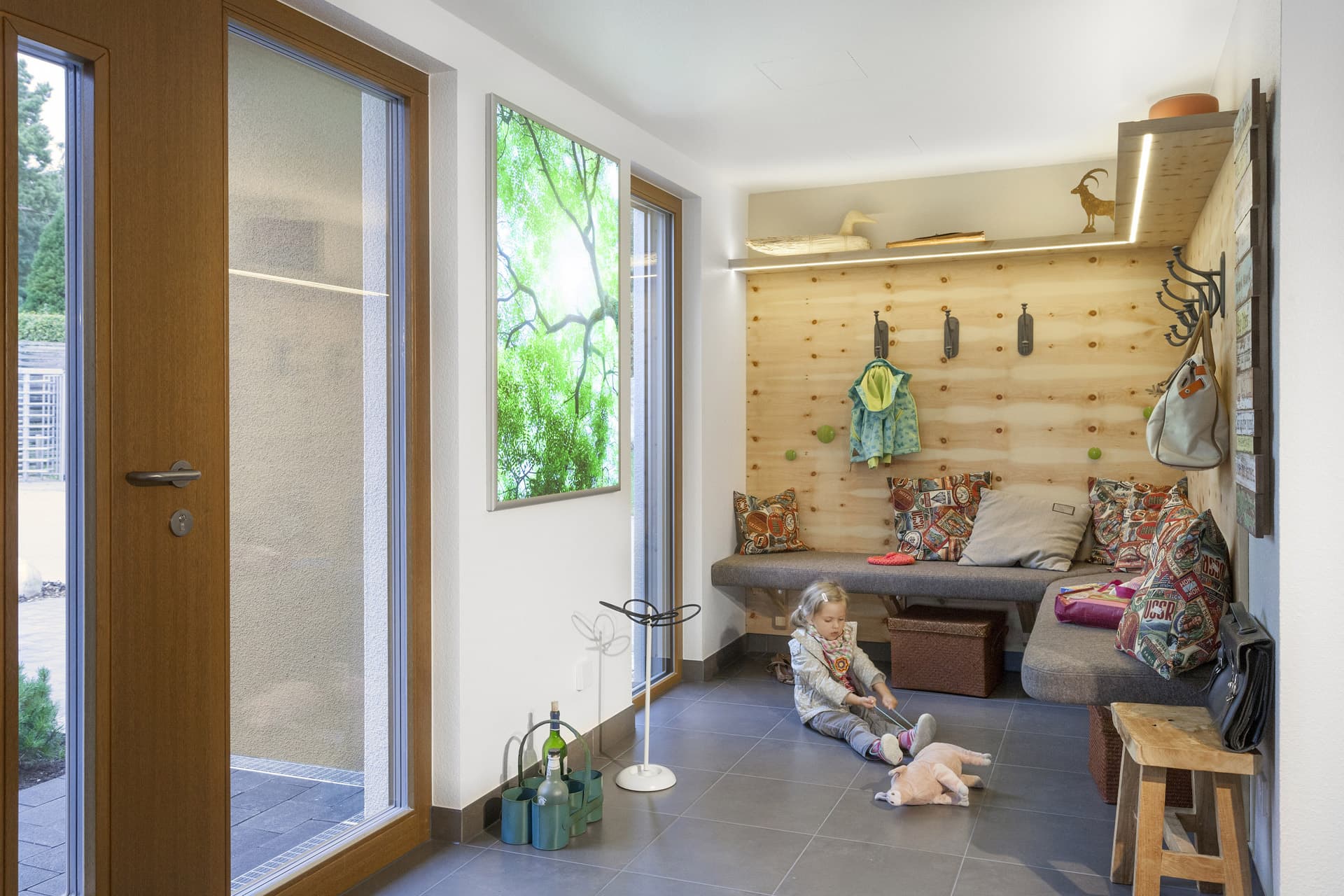 Familie Schmitt wäre bei ihrem Besuch im neuen Schwörer-Musterhaus in Villingen-Schwenningen am liebsten gleich dageblieben und eingezogen, so gut haben die Architektur, der familienfreundliche Grundriss und die cleveren Einbauideen aus der Schwörer-Designschreinerei gefallen. „Schon die große Diele mit der Sitzbank bietet viel Stauraum und Platz für den Kinderwagen“, sagt die Mutter. „Extrazimmer und Duschbad im EG, offene Wohnküche, großer Spielflur – man merkt bei jedem Schritt, dass sich die Planer bei diesem Haus Gedanken über flexible Nutzungsmöglichkeiten gemacht haben. Durch die vielen offenen oder miteinander verbundenen Räume sind die Wege nicht weit und das Haus wirkt gleich doppelt so groß“, findet der Vater. Als Effizienzhaus 55 angelegt, wird das Haus mit einer Photovoltaik-Anlage optional zum Energieplus-Haus, das mehr Energie produziert als es verbraucht.