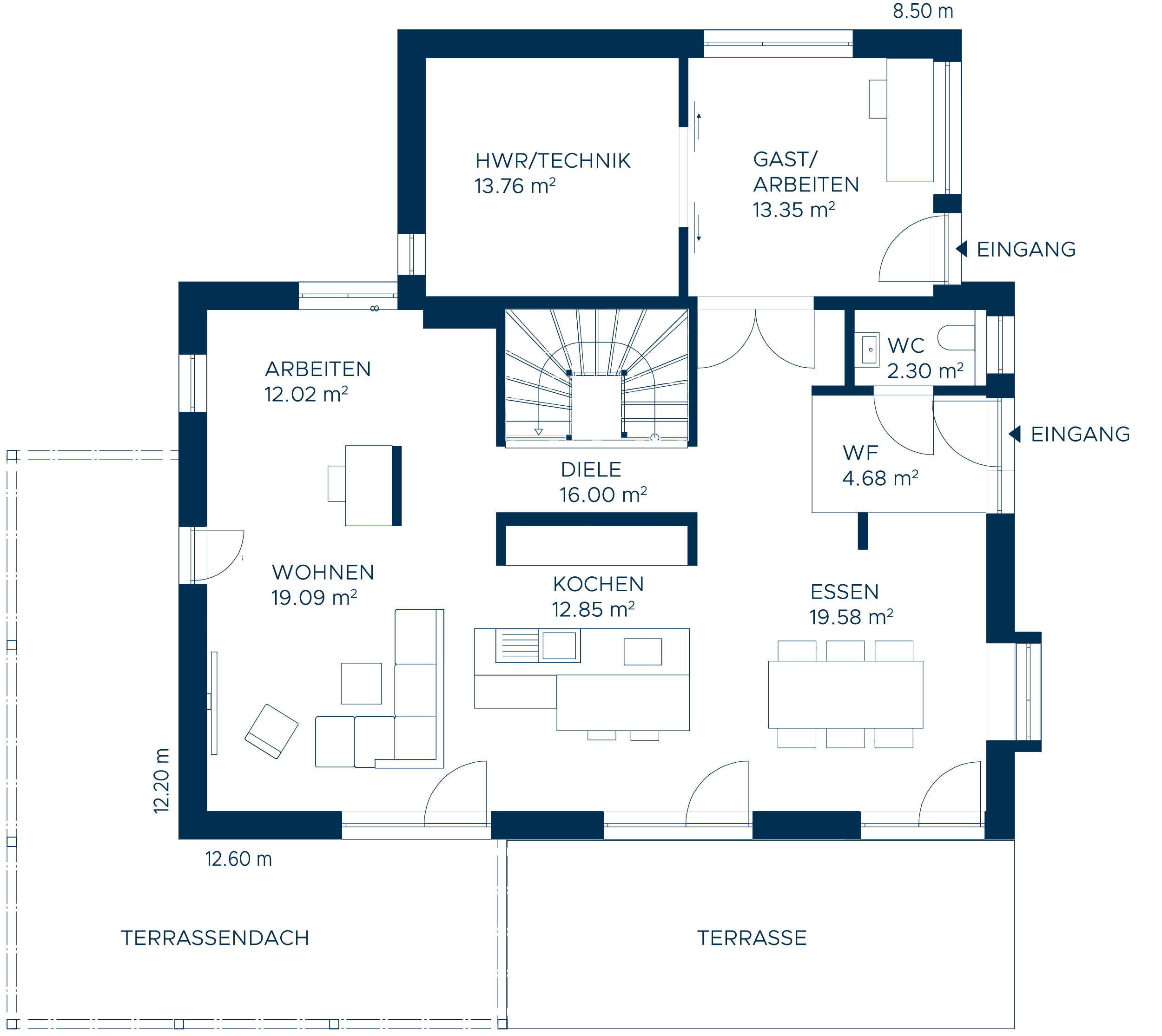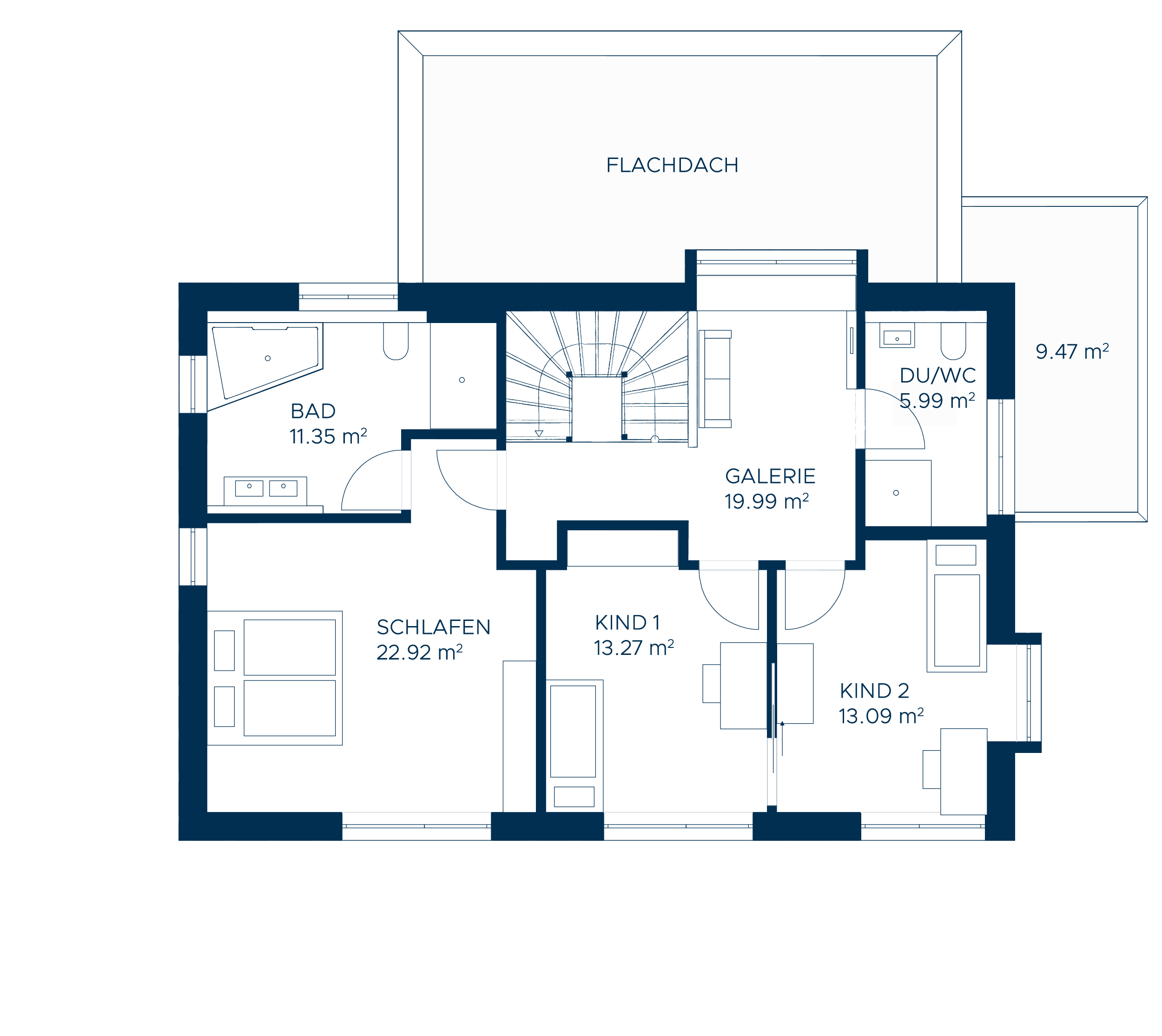Der Grundriss im Erdgeschoss zeichnet sich durch Offenheit aus. Die Küche bildet hierbei den zentralen Mittelpunkt, der Wohn- und der Essbereich wurden jeweils auf den gegenüberliegenden Seiten des Hauses angeordnet. Das Homeoffice ist getreu dem Grundsatz der Offenheit und Weitläufigkeit kein extra Zimmer, sondern halboffen an den Wohnbereich angegliedert. Die so entstehenden weiten Blickachsen reichen über das Wohnen bis hin auf die Terrasse und den Garten. Das Obergeschoss verfügt über einen Elternbereich „en suite“, also mit integriertem Masterbad, während die beiden Kinderzimmer gleich groß sind und durch ein Schiebeelement miteinander verbunden werden können. Das Highlight bildet ein Kids Corner in der großzügigen und lichtdurchfluteten Galerie mit einem gemütlichen Sitzfenster, das den Kindern einen gemütlichen Rückzugsort bietet.