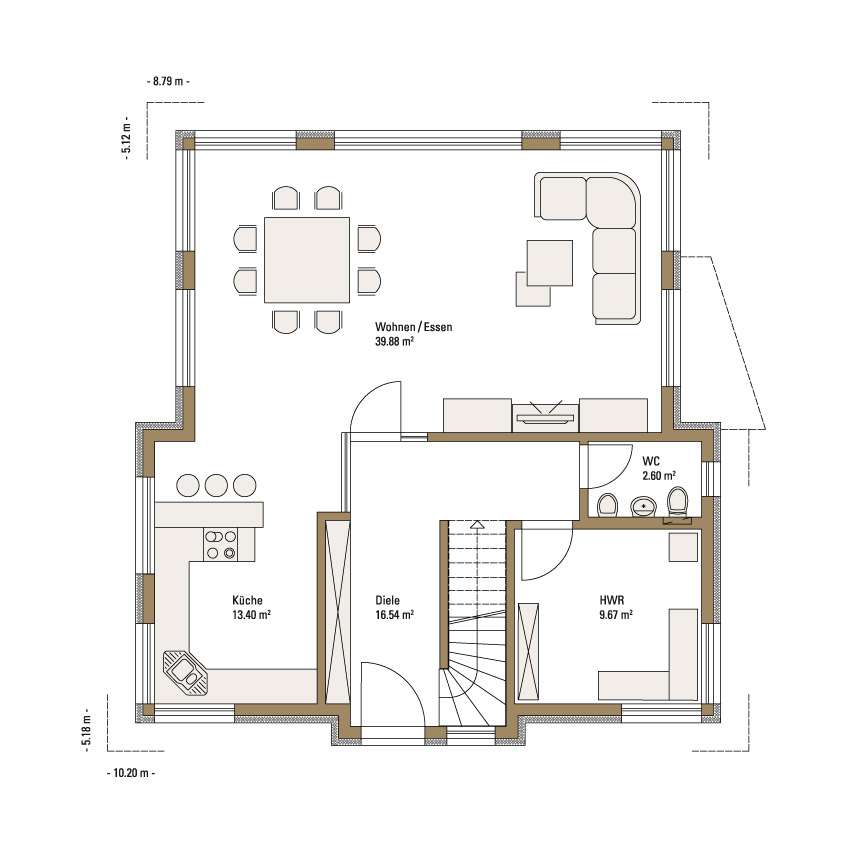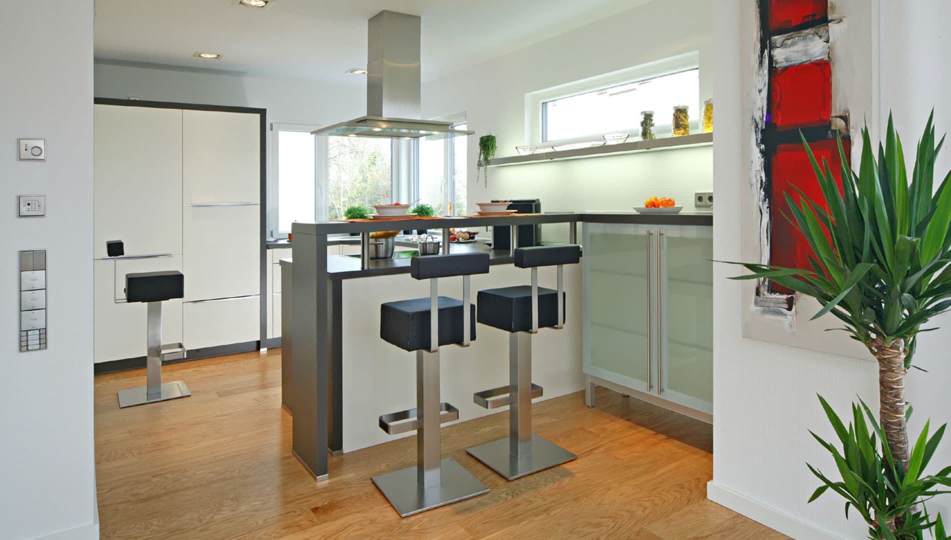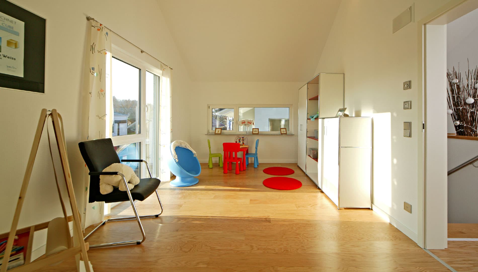 Auf KfW-40-Standard konzipiert zeigt sich das Einfamilienhaus in einer modernen, stimmigen Architektur. Versetztes Pultdach, offenes Wohnen im Erdgeschoss, lichtdurchflutete Räume, durchdachter und bedarfsgerechter Grundriss - eben typisch WEISS. Das kommunikative Zentrum des Hauses ist der Essplatz, in Verbindung mit der geräumigen, offenen Küche und Ess-Theke. Große Fensterflächen ermöglichen seinen Bewohnern einen freien, unverbauten Blick auf die Schönheiten der Region. Die Region und WEISS - eine Freundschaft, die wir vertiefen werden!