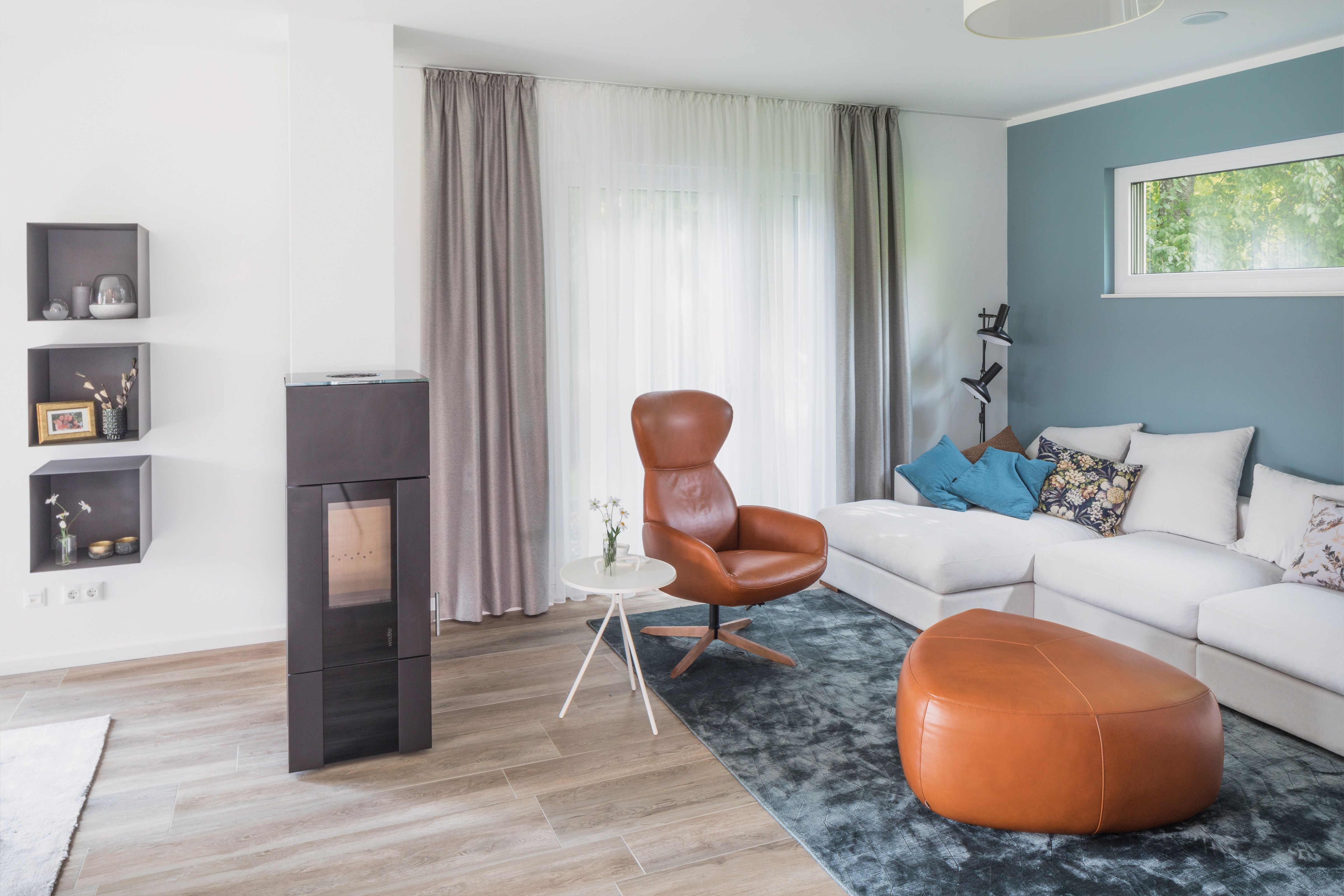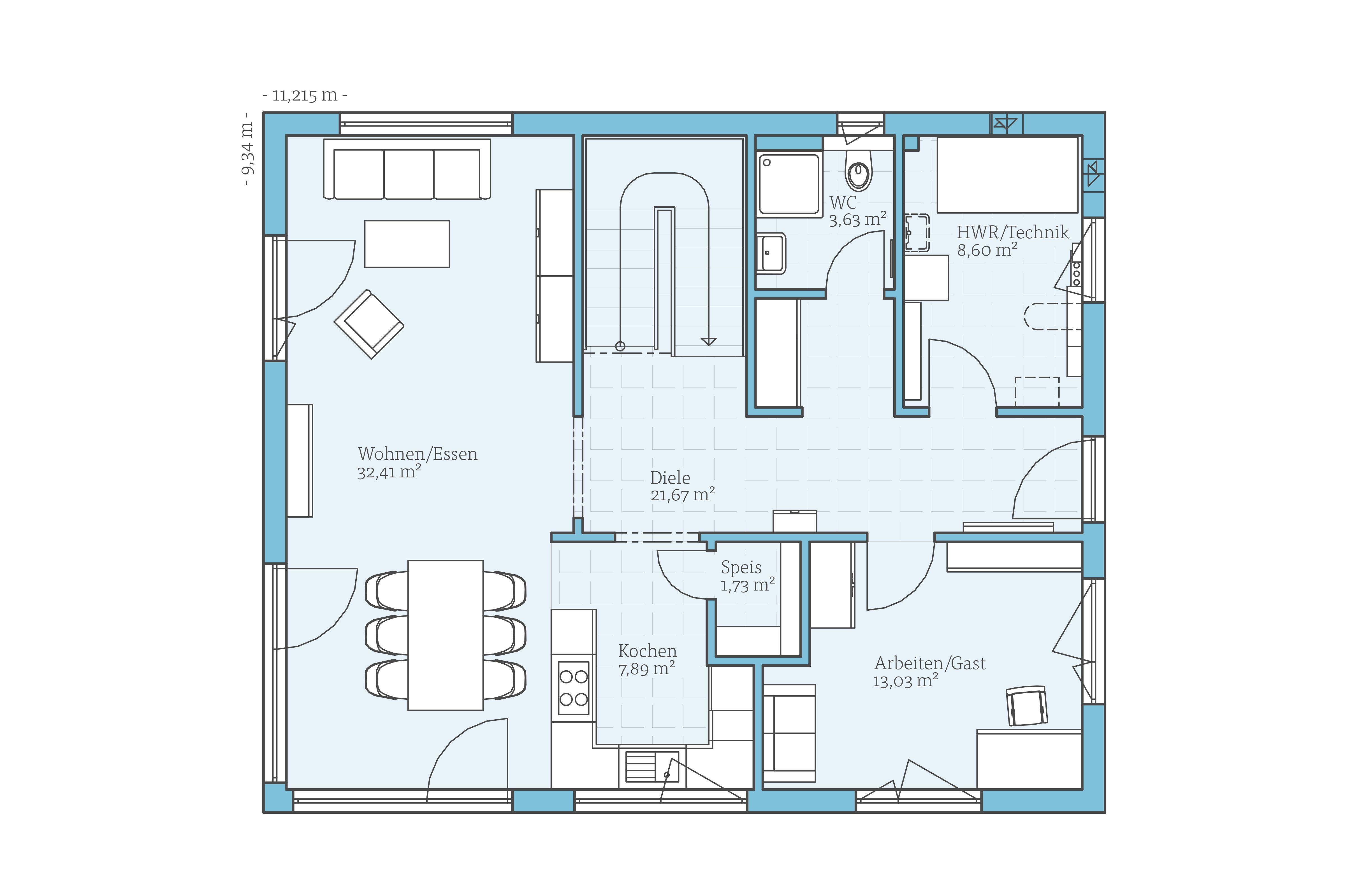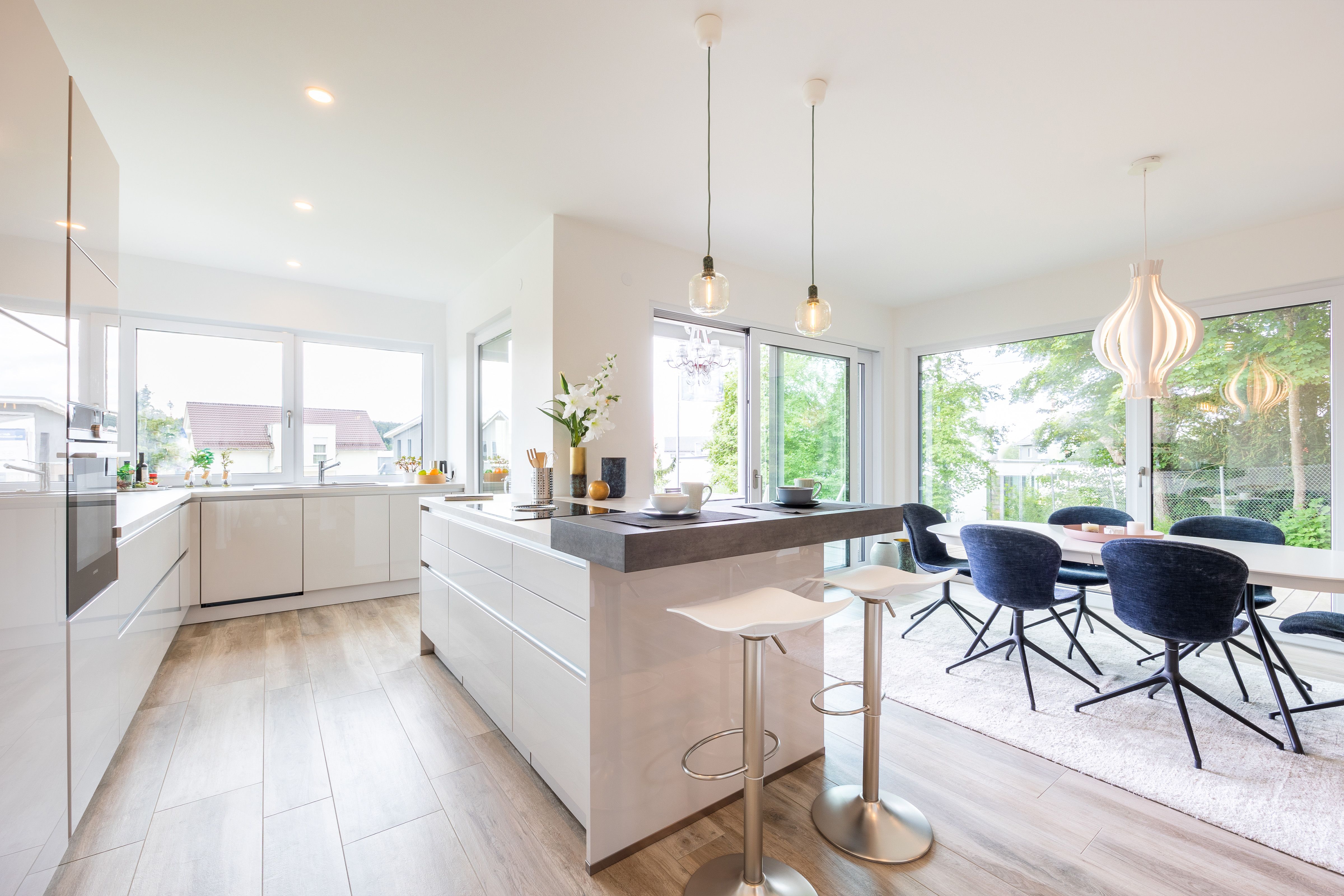 Die beliebte Villa 177 ist die optimale Grundlage für eine individuelle Hausplanung. Der Erdgeschossgrundriss wurde für das Musterhaus in Villingen-Schwenningen gleich an zwei Seiten um ein Anbauteil ergänzt. An der Küche vergrößert ein holzverschalter Anbau den Kochbereich und schafft gleichzeitig einen überdachten Freisitz, der über eine große Terrassentür auch aus dem Essbereich erreichbar ist. Als zweites Anbauteil fällt sofort der Carport auf, der auch den Eingangsbereich überdacht und Stellfläche für Fahrräder, Mülltonnen und Co. schafft.