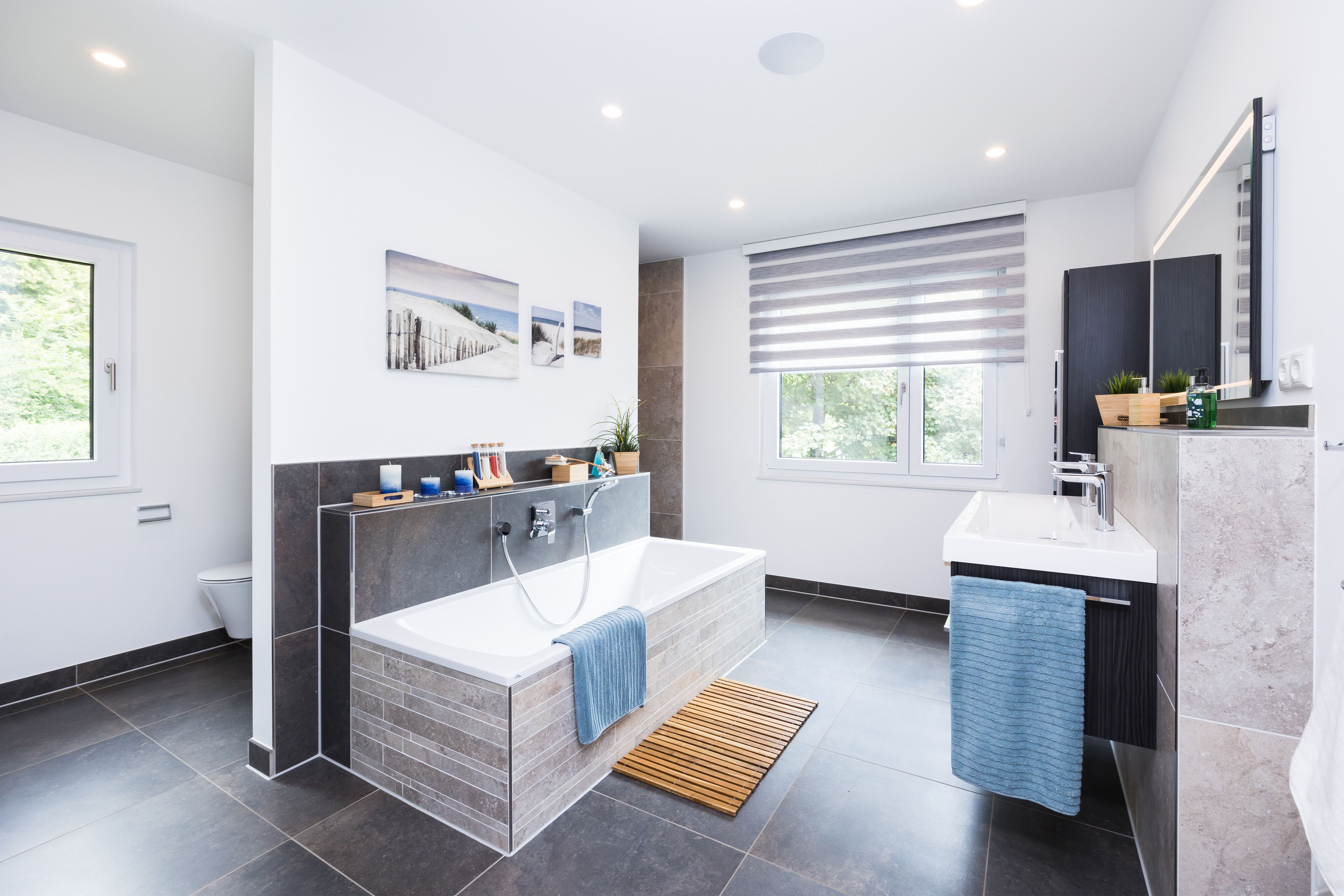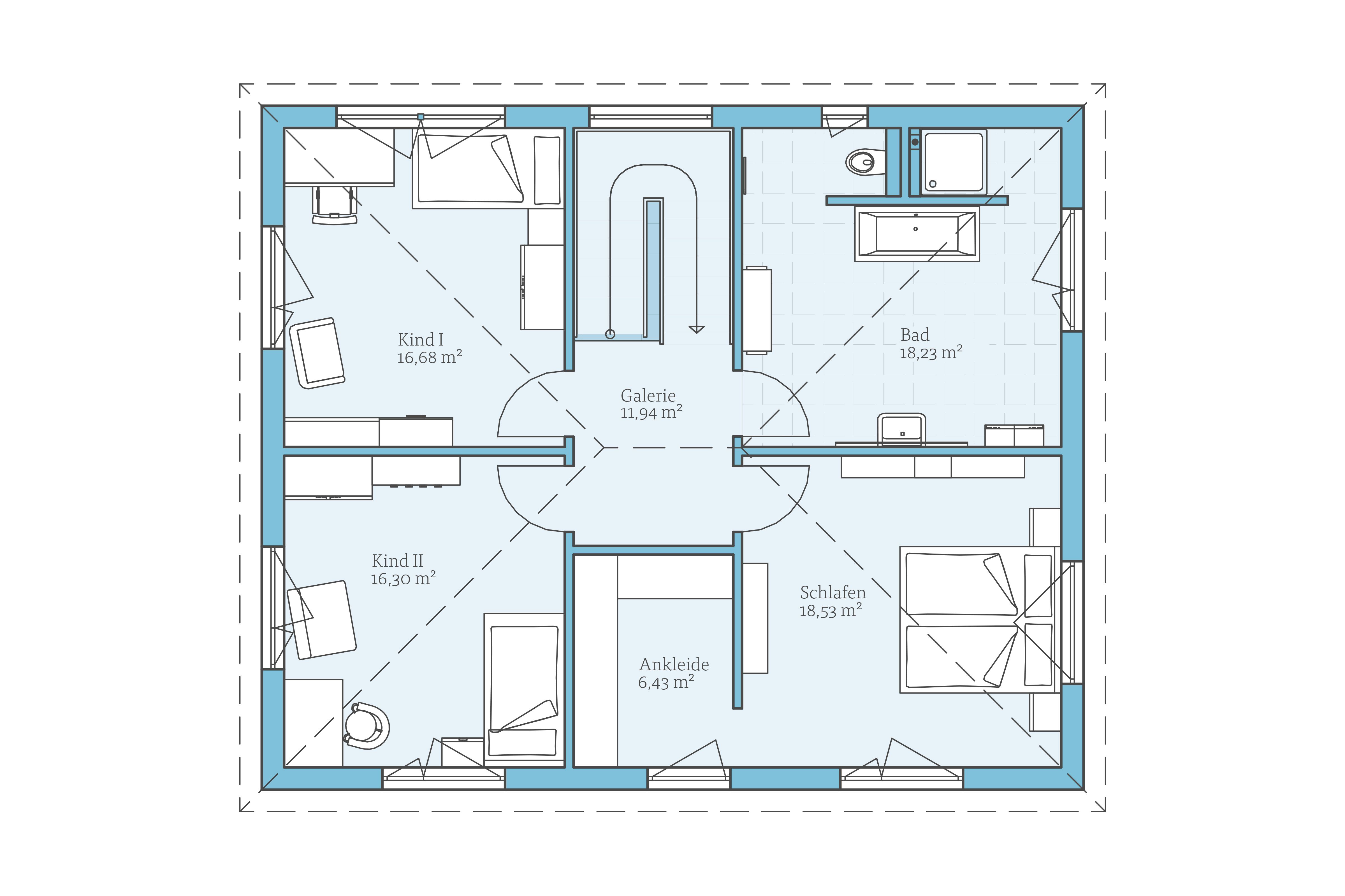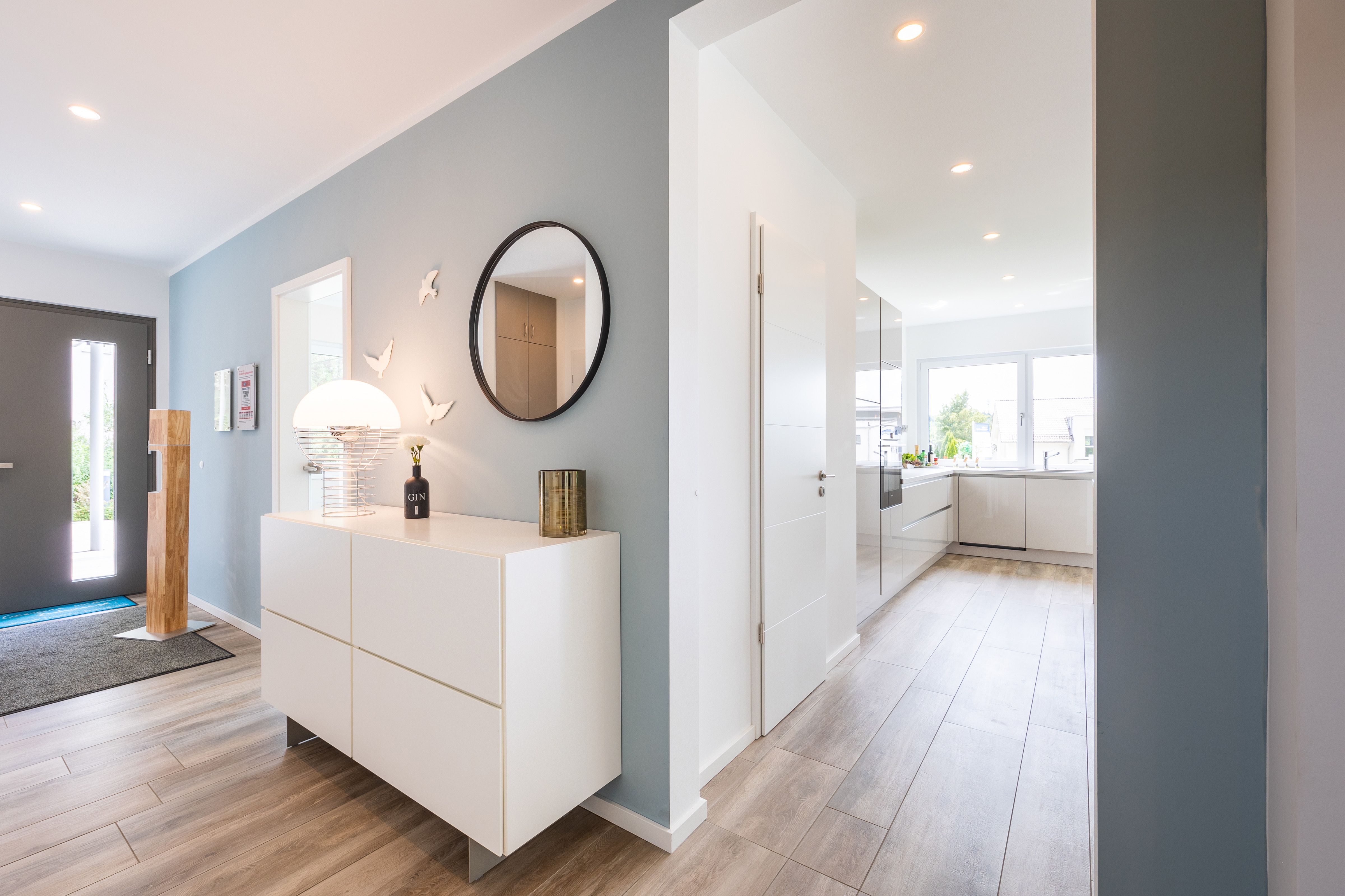 Die beliebte Villa 177 ist die optimale Grundlage für eine individuelle Hausplanung. Der Erdgeschossgrundriss wurde für das Musterhaus in Villingen-Schwenningen gleich an zwei Seiten um ein Anbauteil ergänzt. An der Küche vergrößert ein holzverschalter Anbau den Kochbereich und schafft gleichzeitig einen überdachten Freisitz, der über eine große Terrassentür auch aus dem Essbereich erreichbar ist. Als zweites Anbauteil fällt sofort der Carport auf, der auch den Eingangsbereich überdacht und Stellfläche für Fahrräder, Mülltonnen und Co. schafft.